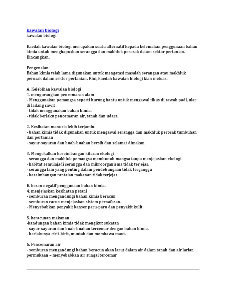 Mar 23 2010 Kaedah kawalan biologi merupakan suatu alternatif kepada kelemahan penggunaan bahan kimia untuk menghapuskan serangga dan makhluk perosak dalam sektor pertanian. Penggunaan varieti resisten. Mar 04 2020 Berikut dikongsikan kawalan biologi dalam pertanian iaitu kebaikan dan keburukan untuk panduan semua.
