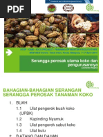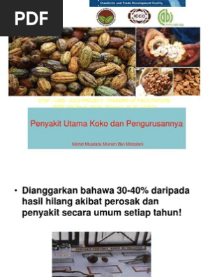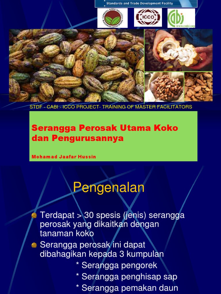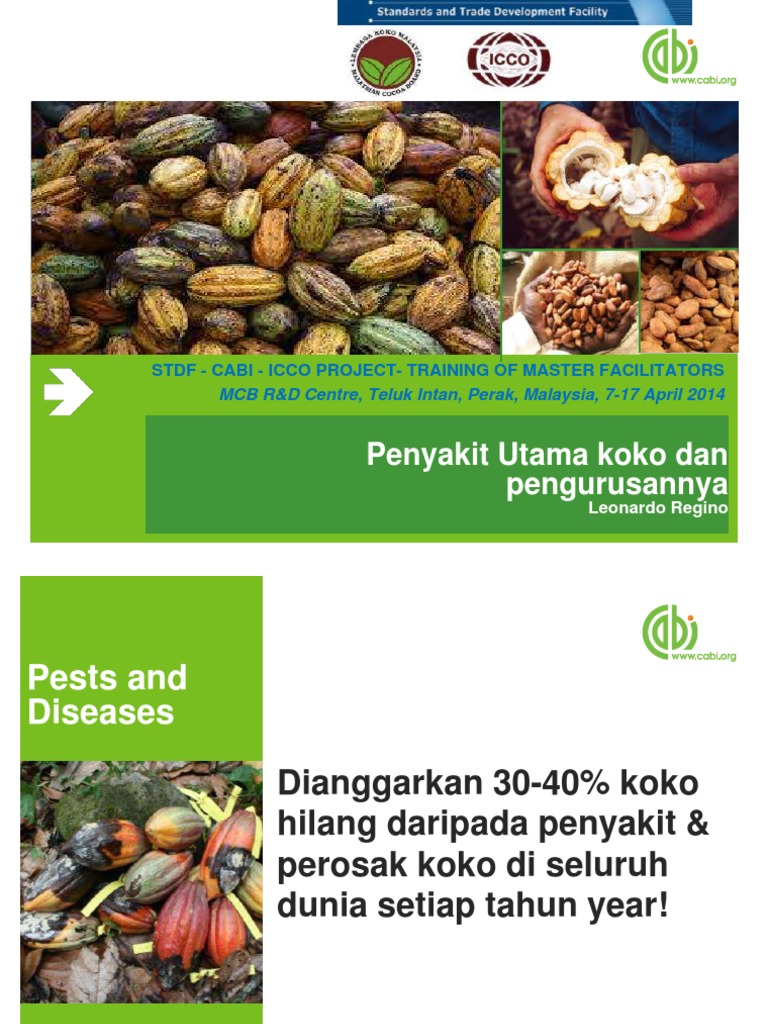 Penerangan berkaitan setiap perosak mahupun penyakit ini akan dibantu dengan gambar-gambar serangga perosak lain mahupun penyakit berserta simptom-simptom bagi. Penyakit koko Menerangkan berkaitan penyakit koko simptom serangan dan kawalan. Slide presentations for Training of Facilitators for farmer leaders and local extension staff in Jengka Pahang Malaysia 16 - 20 June 2014.